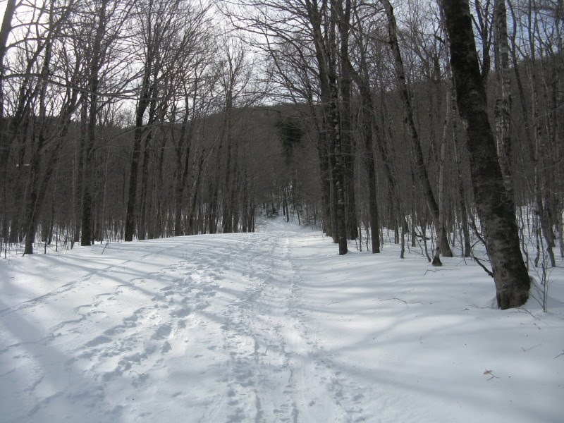 In winter, the trek to the pond starts at Rt. 302 with a 0.3 mi. climb up the unplowed access road. The snowshoe track here was hardpacked, almost glazed, making for easy bare-booting.