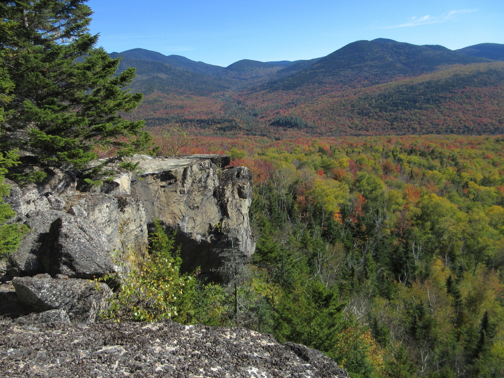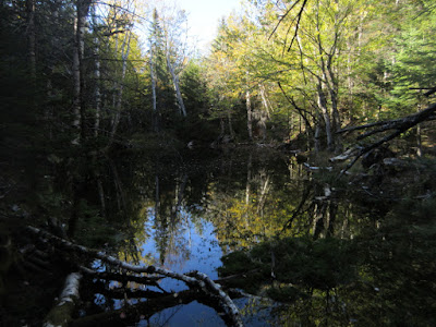 It was a glorious October day - sunny and crystal-clear with a high around 60 - ideal for bushwhacking to some ledges with sweeping views of the surrounding peaks and valleys in the Pemigewasset Wilderness, with a bit of evening time along the East Branch.