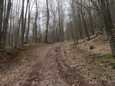 On Saturday, our last day of vacation, I took a solo hike to two more Catskill 3500-foot peaks, Vly Mountain and Bearpen Mountain, located outside the NW edge of the Catskill Park. Both summits are in the Bearpen Mountain State Forest, though the slopes are largely privately owned. I approached from the end of County Route 3 on the north outside Prattsville, where a parking spot is shown on the NY/NJ Trail Conference map. The hike begins with a steadily ascending slog up a hardpacked woods road/snowmobile trail to the Vly/Bearpen col, rising 1150 ft. in 1.3 miles.