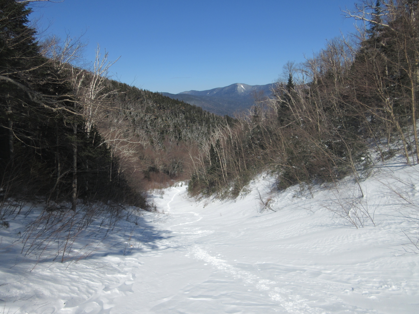 After some more conifer wrestling, we popped out onto the brookbed/slide track at a point where it became mostly buried in deep snow. On the advice of master bushwhacker J.R. Stockwell, I had used this brookbed on a visit to the slides on a snowy day four years ago.