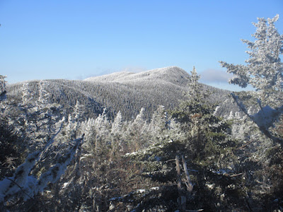 With deep snowpack, the summit area offers a nice view east over the Wild River and Caribou-Speckled Mountain Wilderness areas.