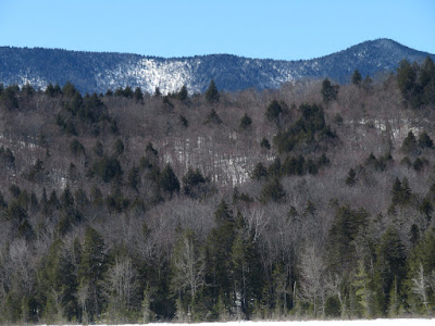 After crossing a nearby snowmobile trail, I emerged into the great wide open at the southwest end of Church Pond. It was solidly frozen with a layer of crusty snow on top. (With warm weather in the forecast, both the river and pond crossings will soon become unsafe.)