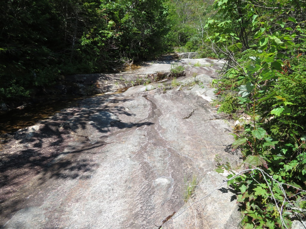 A headwall terminates the open lower part of the slide. The wet sections of ledge are as slippery as ice.