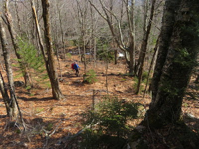 I descended the lower part of the valley on the Mount Tripyramid Trail, which wasn't postholed after all - only at the stream crossing. Here old ski tracks are evident along a sidehill section of the trail.