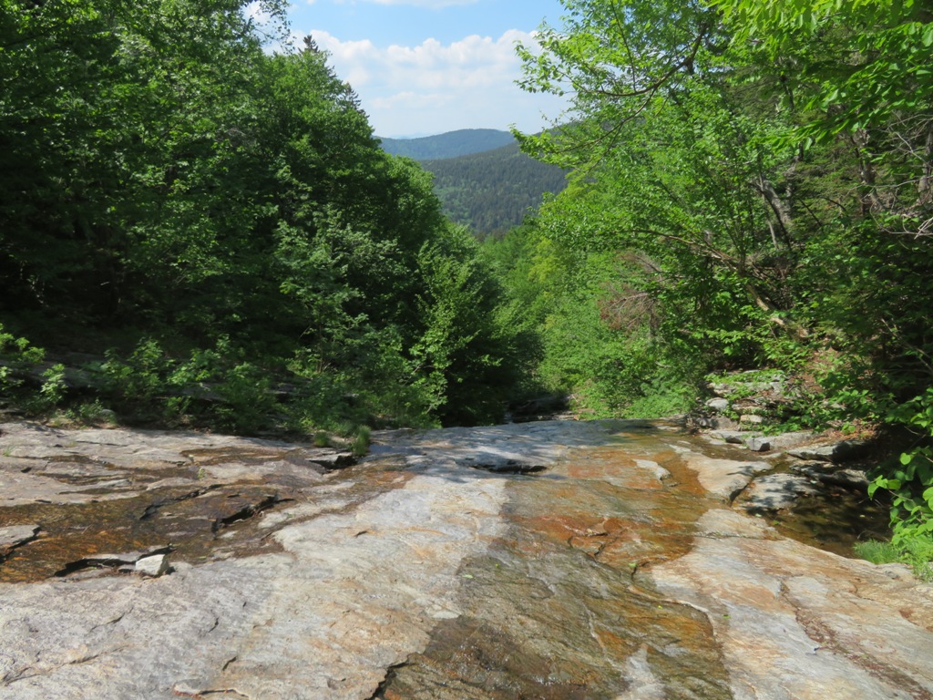 I reached Downes Brook at one more interesting rock feature, a sort of half-flume on the streambank. A mosquito-pestered return along the Downes Brook Trail concluded an interesting if sweaty day.