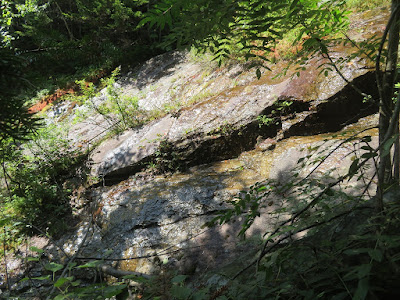 On this sunny hot, humid day it was actually fairly cool when I started at 8 am, but it was mighty toasty when I came out a little before 1 pm. On this hike into Mad River Notch I bushwhacked up to mid-level open slabs on the two southernmost old slides on the east face of East Osceola.