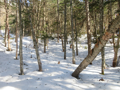 A shorter bushwhack would have been possible by following Falling Waters Trail up to its last brook crossing, but that would entail a route directly up the brook after its snow bridges had been blown out and replaced with icy rocks. And I wanted to avoid the several brook crossings on the trail as well as presumably icy steep pitches alongside the waterfalls. So I spiked just a half-mile up the choppy, hard-frozen trail, and was glad to get off it, donning snowshoes and heading up into the hardwoods on the lower part of Mt. Lincoln's western ridge. This is unofficially known as "Carpenter's Ridge," after Frank O. Carpenter, who built a trail up it in 1897, only to see it obliterated by logging within a few years.