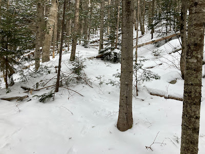 To approach the ledges, I hiked up the Tucker Brook Trail, a backcountry ski route that leads from Tucker Brook Road in Franconia to the Taft Trail on Cannon Mountain near the summit of Mittersill Peak. Parts of this historic route were cut by the Civilian Conservation Corps in the 1930s. It is a locally legendary backwoods ski descent that is described in David Goodman's Best Backcountry Skiing in the Northeast. Unlike many backcountry ski trails, it is mainly dry, with less mucky going than many a hiking trail. Its first half mile follows an old road on private land, intersecting several X-C ski trails of the Franconia Inn network. Shortly after it enters the WMNF, it passes through a gorgeous little valley lined with an open, mature hardwood forest