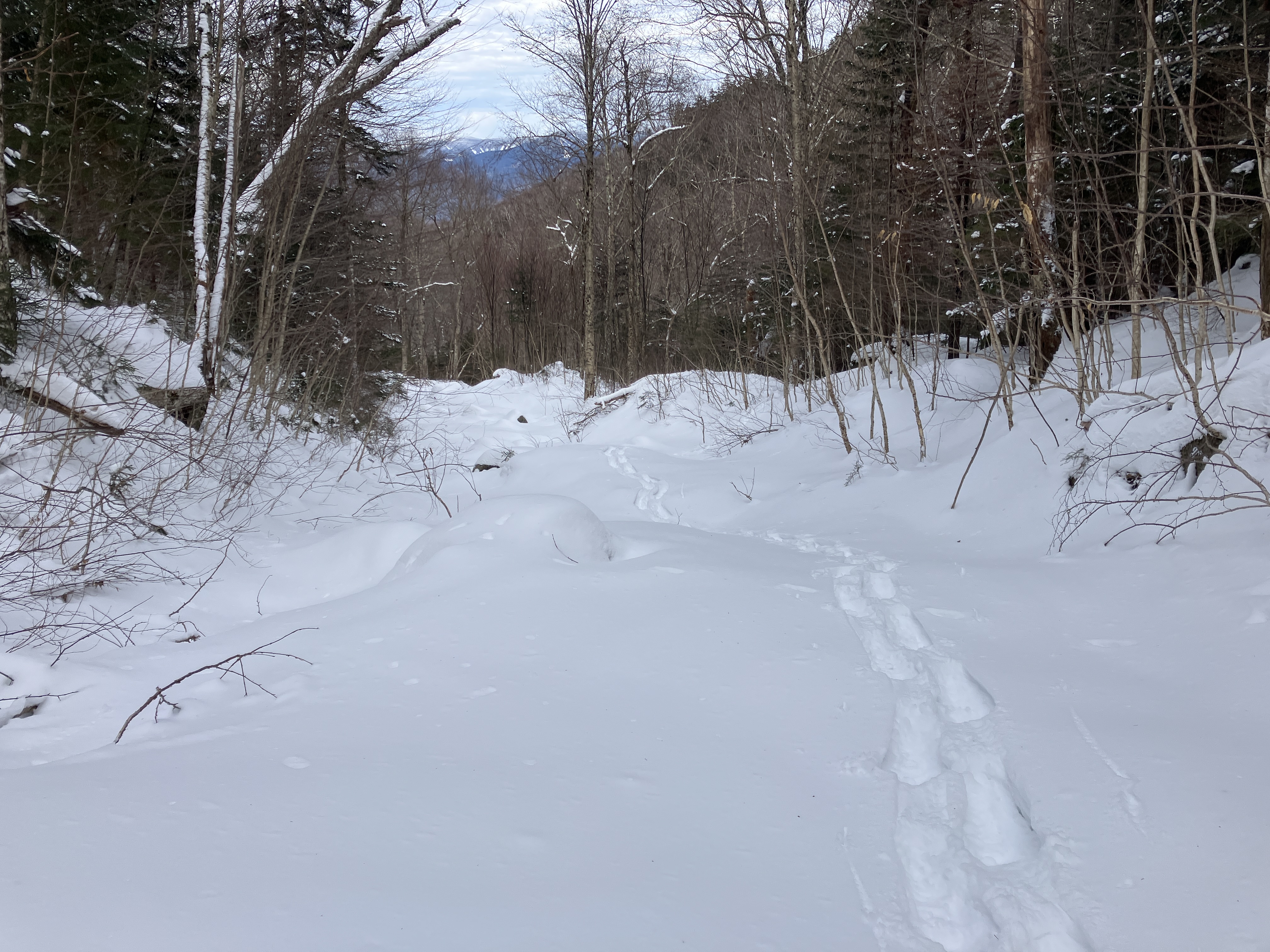 I approached the bushwhack via a one-mile snowshoe on the groomed East Ridge X-C/Snowshoe trails maintained by Loon Mountain (no fee, limited parking).