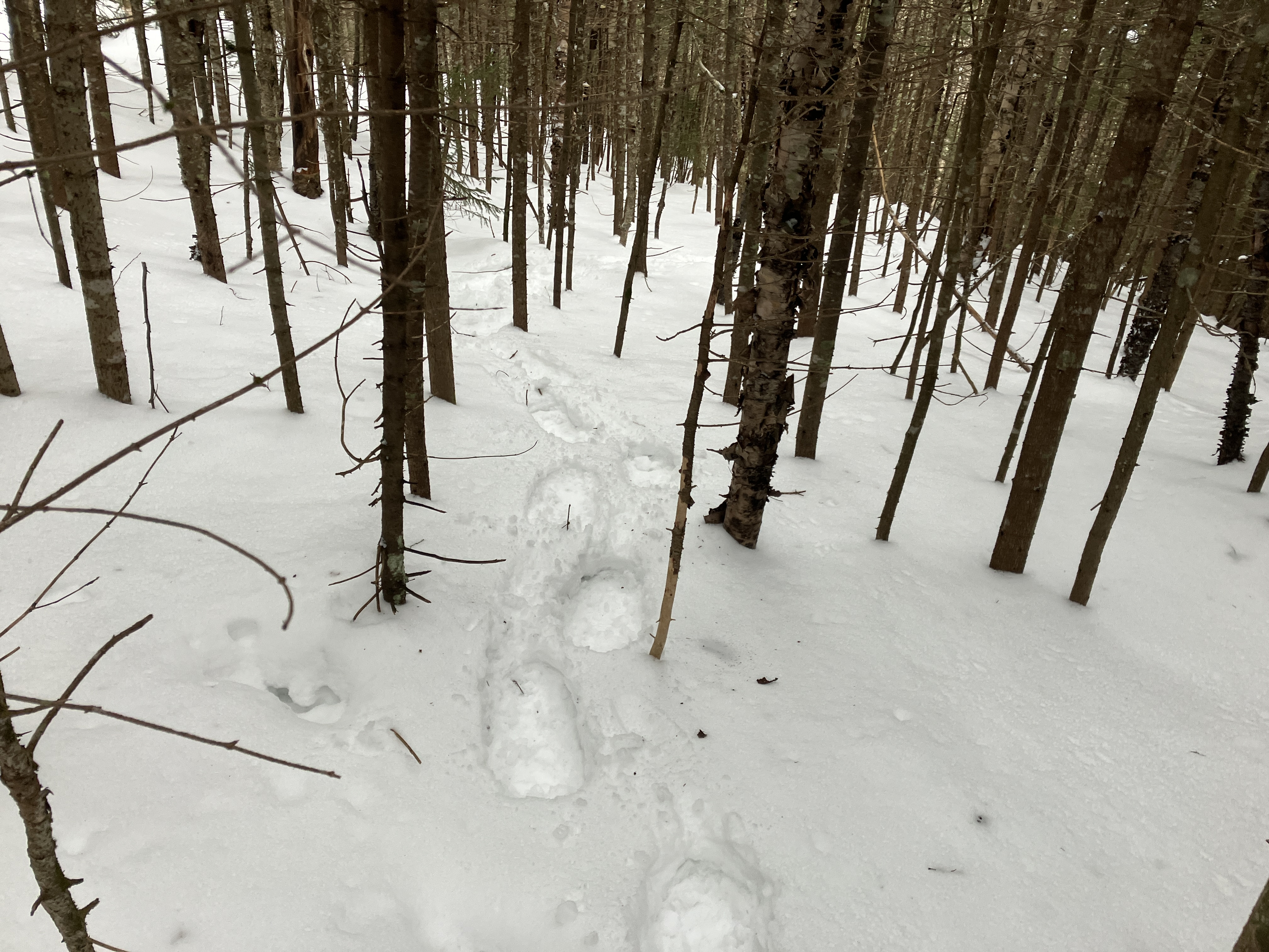There was an excellent firm snowshoe track on the Gale River Trail, with no postholes. I was following the tracks of Ira and Karen, Catskill hikers working on their winter 48. An inch of powder had fallen overnight, and as the sun warmed it, the new snow began clumping under my snowshoes. I had to bang each snowshoe with a pole every few steps. Should have brought some Pam spray.