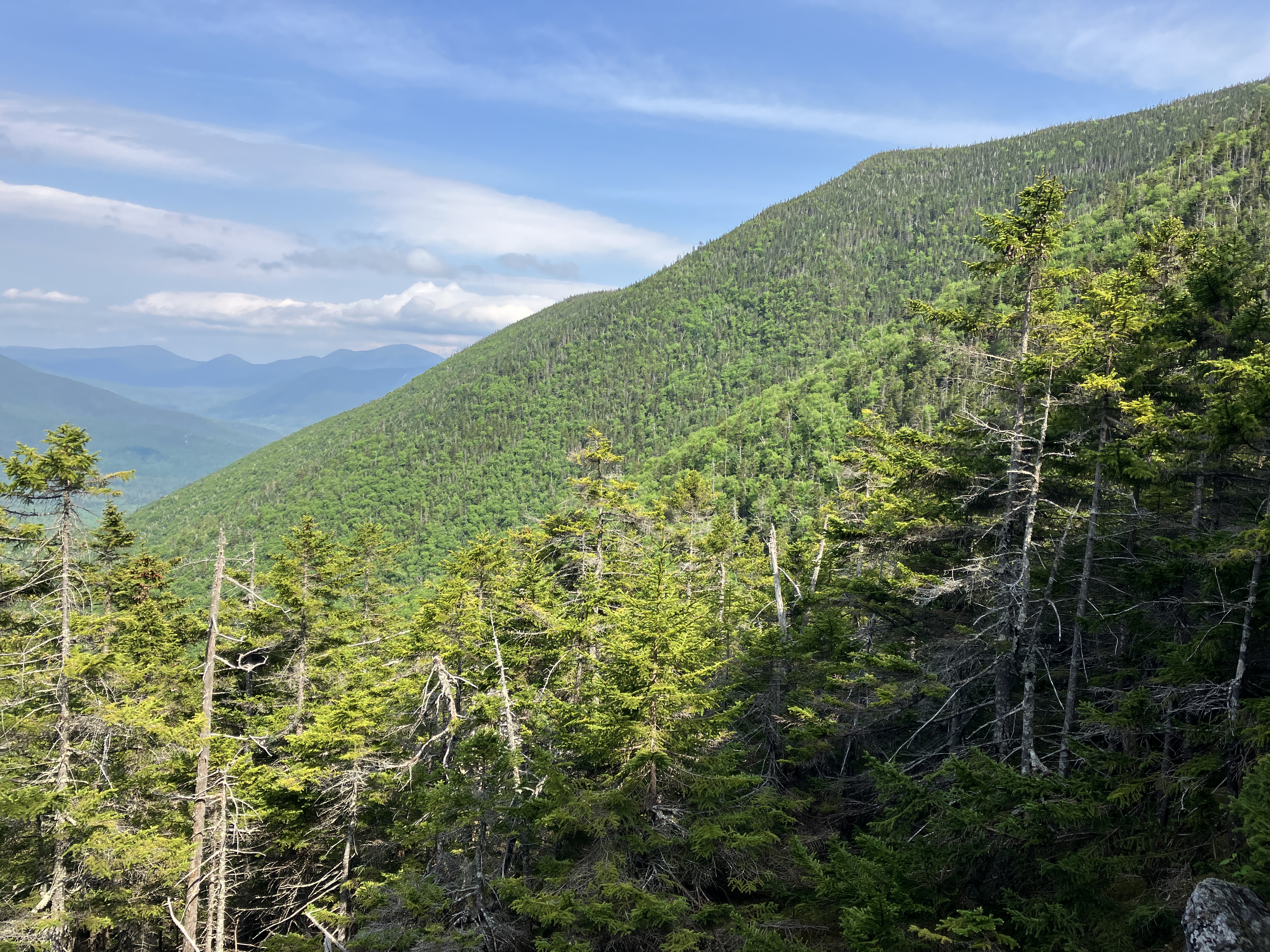 I woke up with an itch for a long walk into the Pemigewasset Wilderness, and with some last minute planning decided to reprise a bushwhack journey I had made back in the summer of 1998 with the late Creston Ruiter. This trip was a probe deep into the beautiful bowl-like valley on the east side of Mount Liberty, featuring a climb up onto the headwall to visit an open patch on an old landslide and a nearby small talus slope. My notes from that hike told of beautiful hardwoods in the valley and fine interior views of the Pemi from the headwall. I knew that a quarter-century later the slide was almost completely revegetated, but I hoped there would still be a view from one open spot, and I figured that the talus slope would still be an open vantage point.