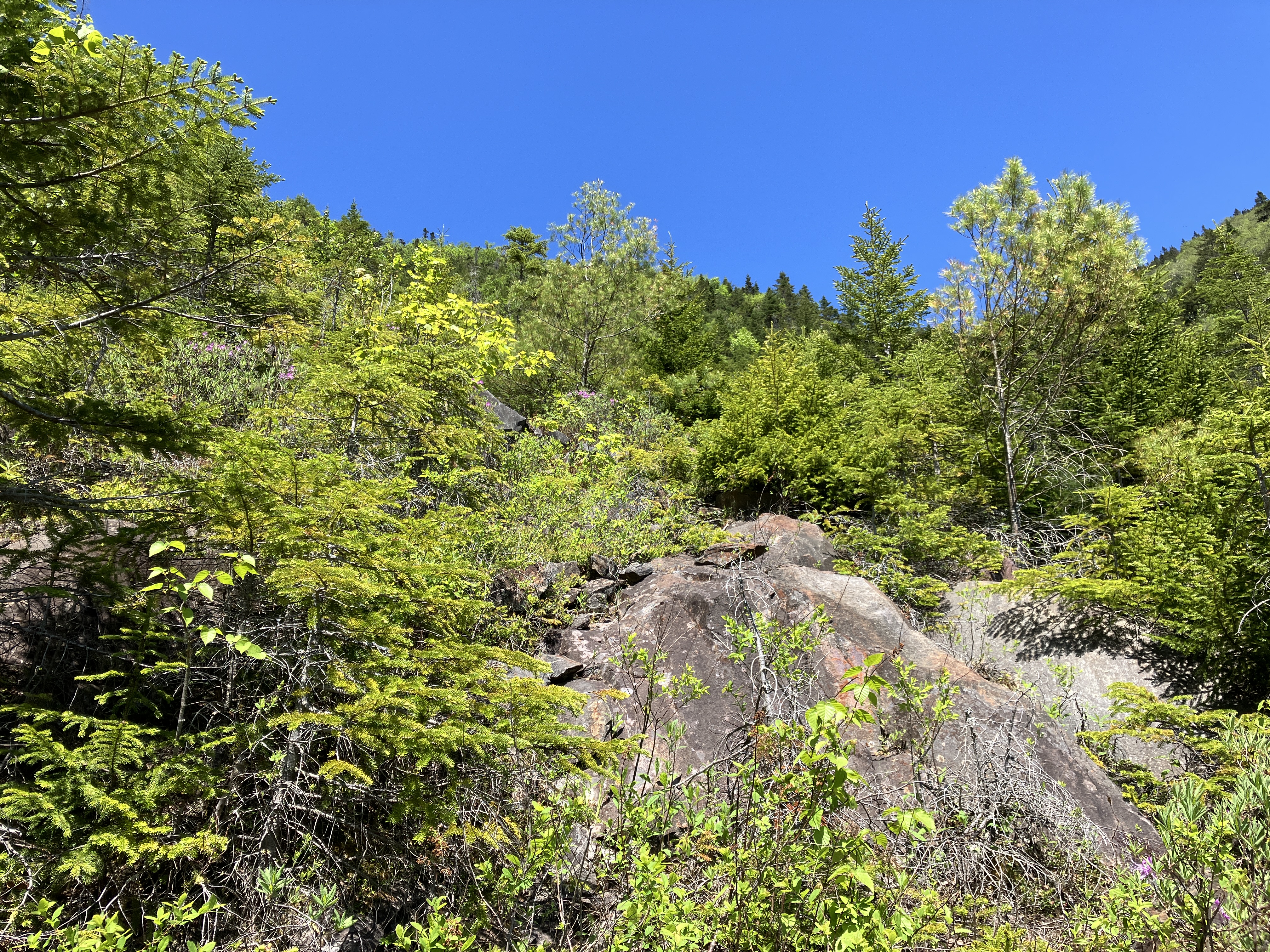 Soon enough I was heading up the lower part of the big north slide. Parts of it are revegetated with spruce, fir, birch and a fair number of white pines.