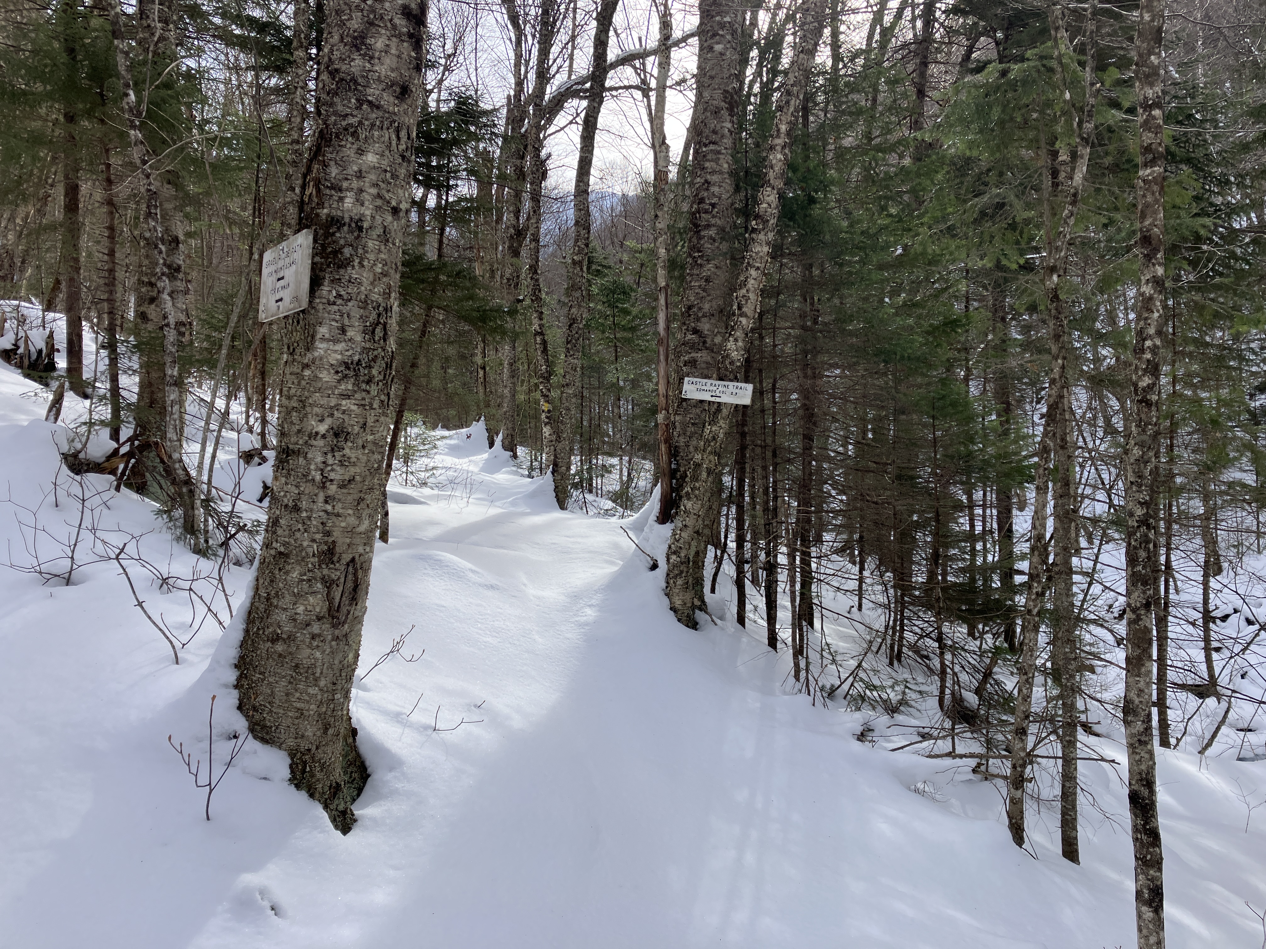 Reaching the junction with Cliffway. This "pleasure path," along with Monaway, Ladderback Trail and Along the Brink, was cut in 1933 by longtime Randolphian, the mapmaker Louis F. Cutter.