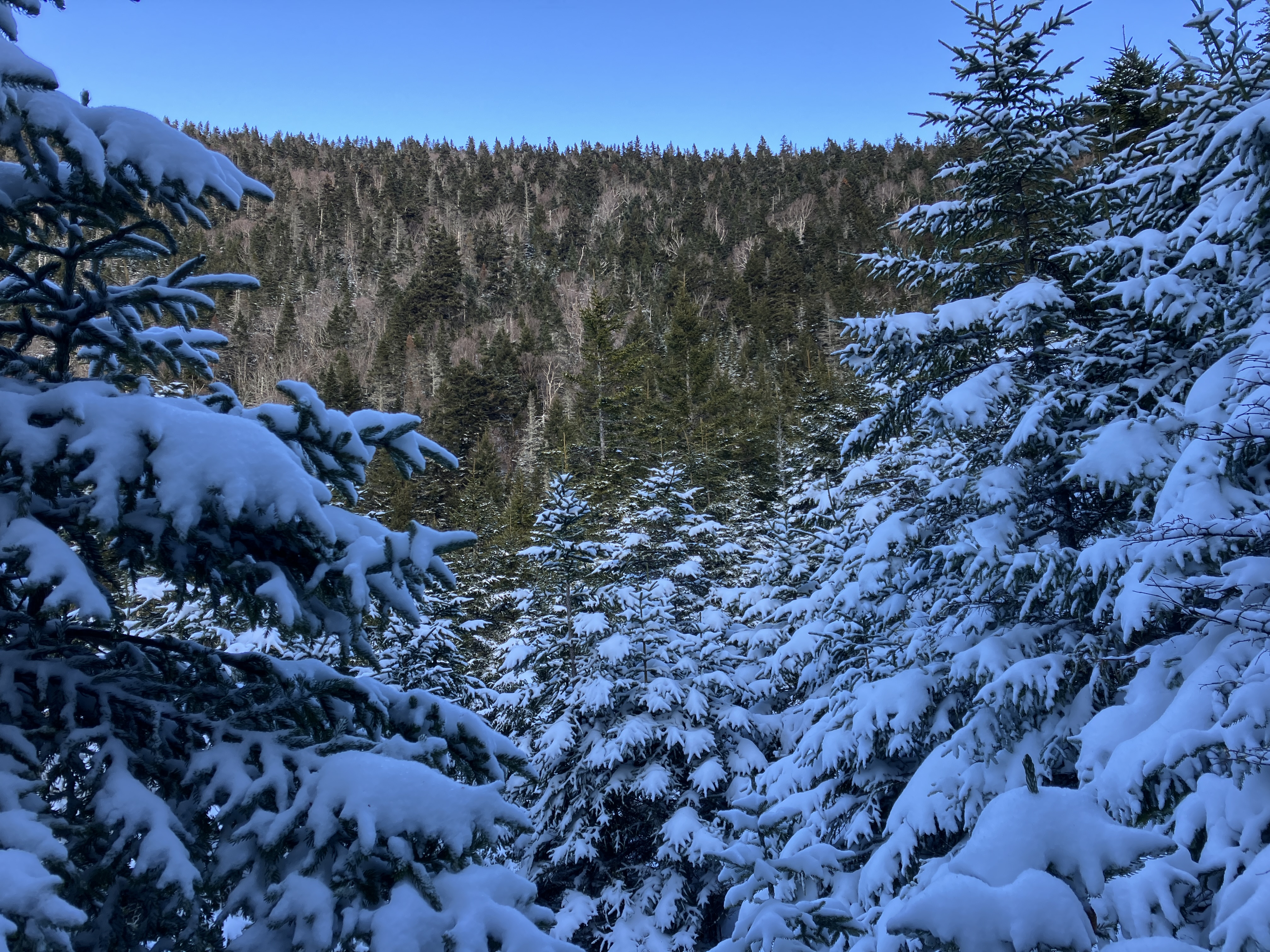 The upper end of the open strip still provides a nice view of Mount Osceola and Mount Moosilauke beyond a shoulder of Scaur Ridge.