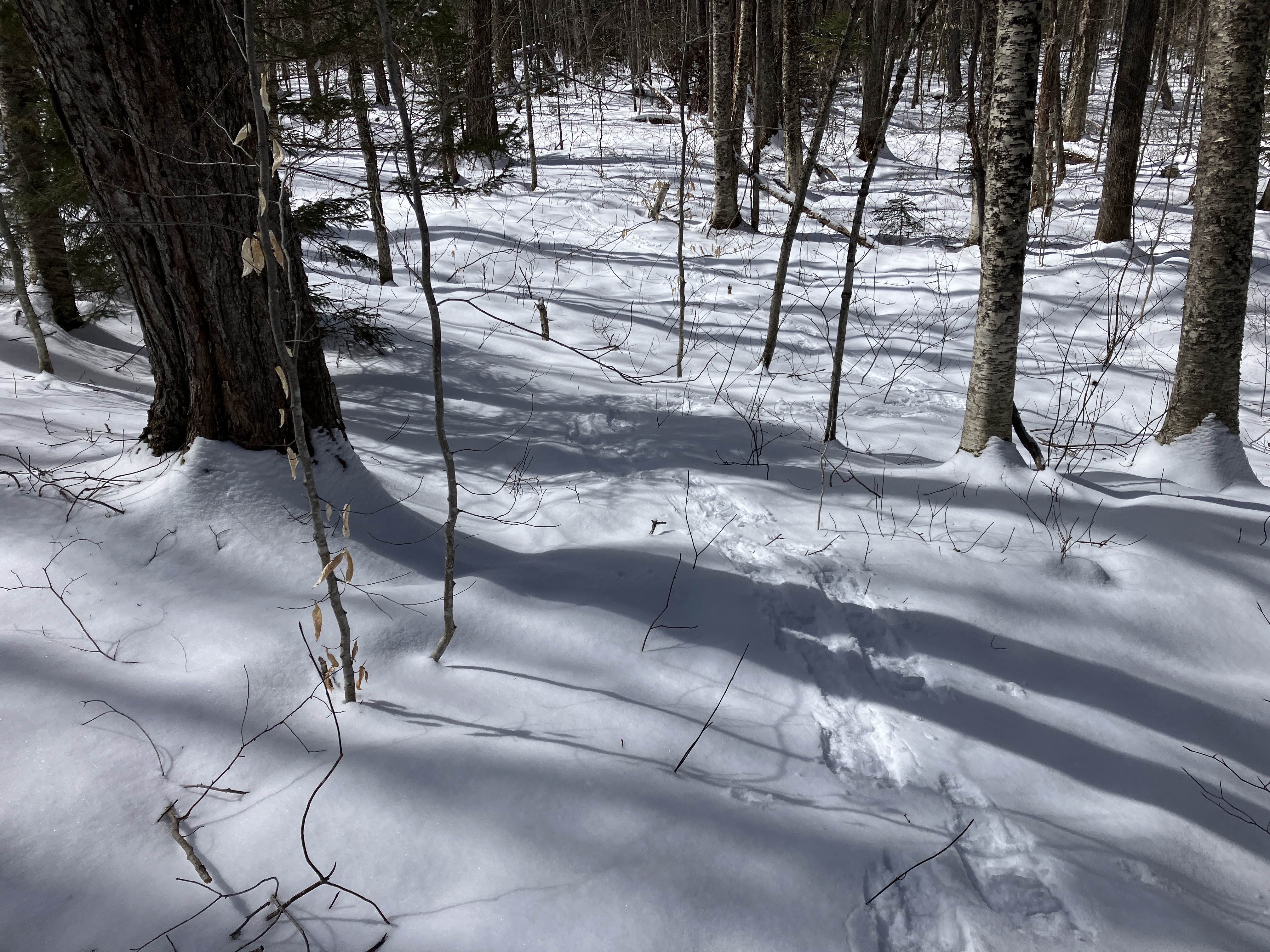 Probably the best bushwhacking conditions of the season, with a couple inches of recent snow atop a rock-solid base. I was concerned that the new snow might clump on my snowshoes as the day warmed, but it never became an issue.