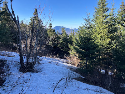 One spot opened an imposing view of Tripyramid's North Slide. Still snow and ice lingering on the steep, narrow "tail."