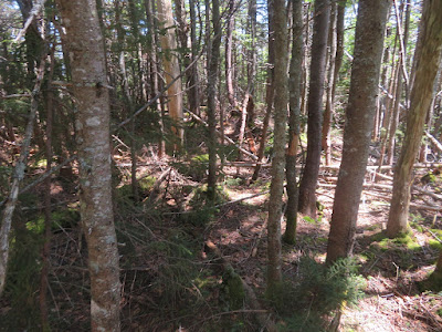 The "cathedral forest" along Passaconaway Cutoff. Hiking this route gave me a chance to check things partway into the season on the Cutoff, the adopted trail of the AMC Four Thousand Footer Committee. The trail looked good overall. Made some notes on a few spots for touch-up hobblebush brushing on the next work trip, and removed a couple of blowdowns.